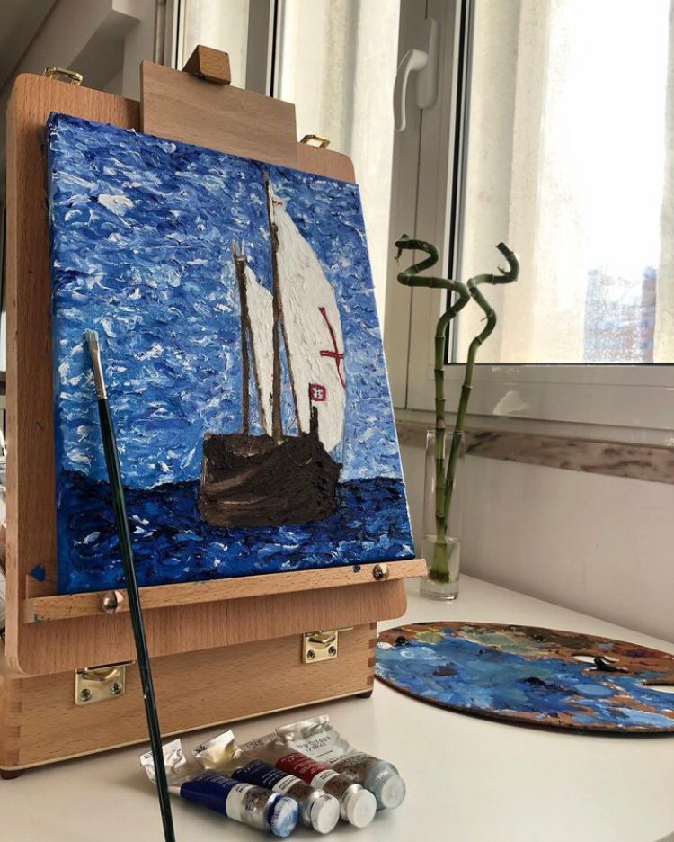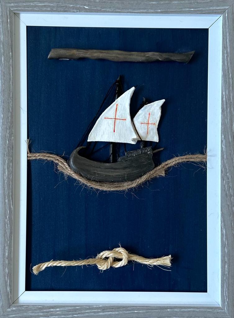 Caravela e um no de marinheiro. Moldura A4 pintada com tinta acrílica, pasta...