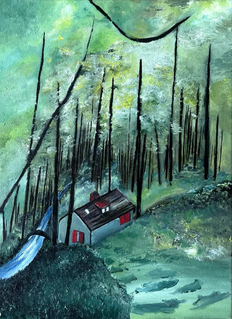 Casa no bosque, óleo sobre tela de algodão 280gm 40x30cm